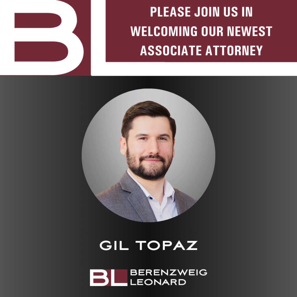 Our BL Team continues to grow, and we are excited to introduce our newest addition – Associate Attorney Gil Topaz! A 2023 graduate of the University of Richmond School of Law, Gil brings his unique experience as a corporate attorney and in-house counsel to the firm. While he works on various matters, his practice focuses on corporate law, mergers and acquisitions, and intellectual property law. Please join us in welcoming Gil to Berenzweig Leonard!